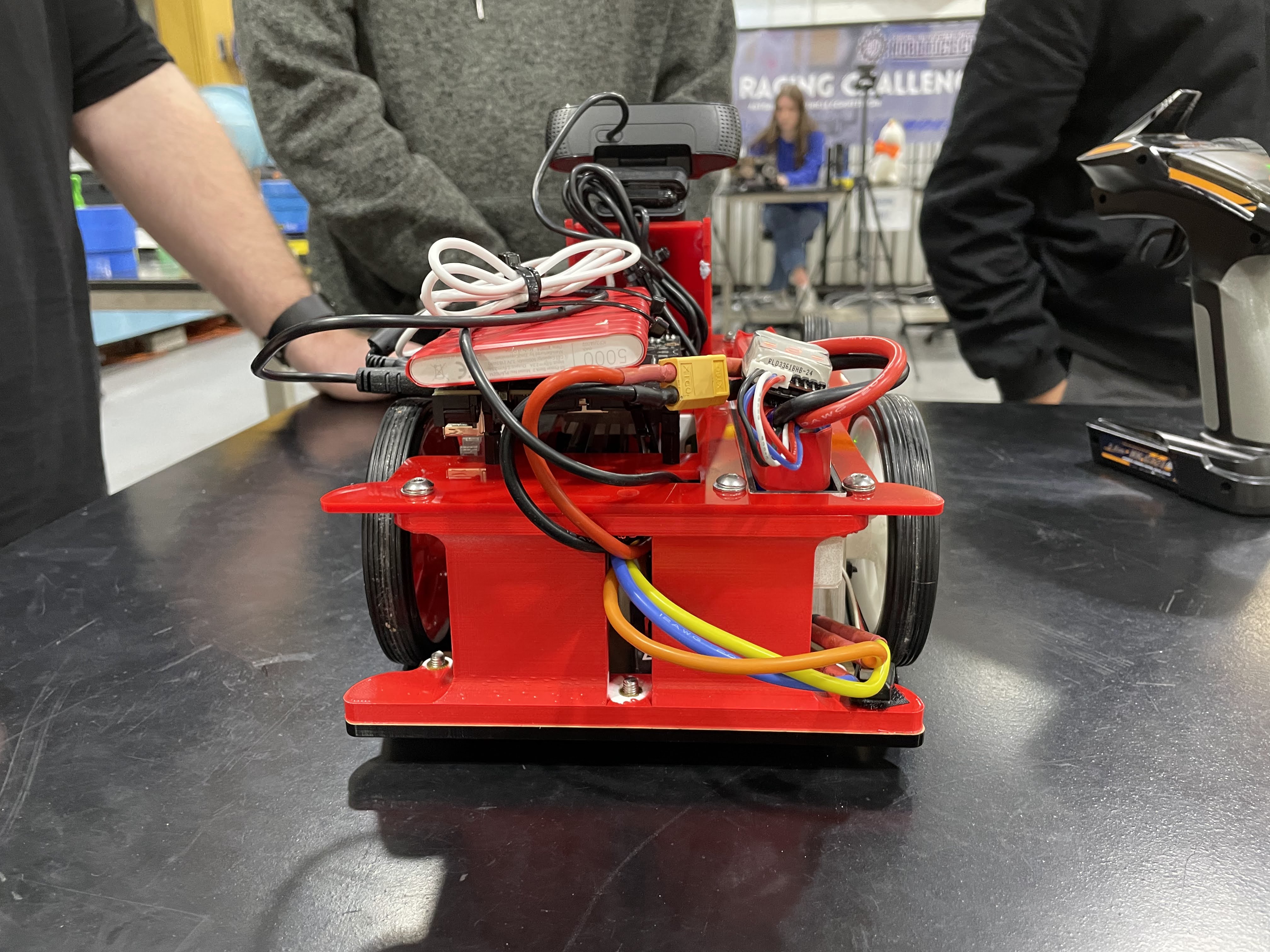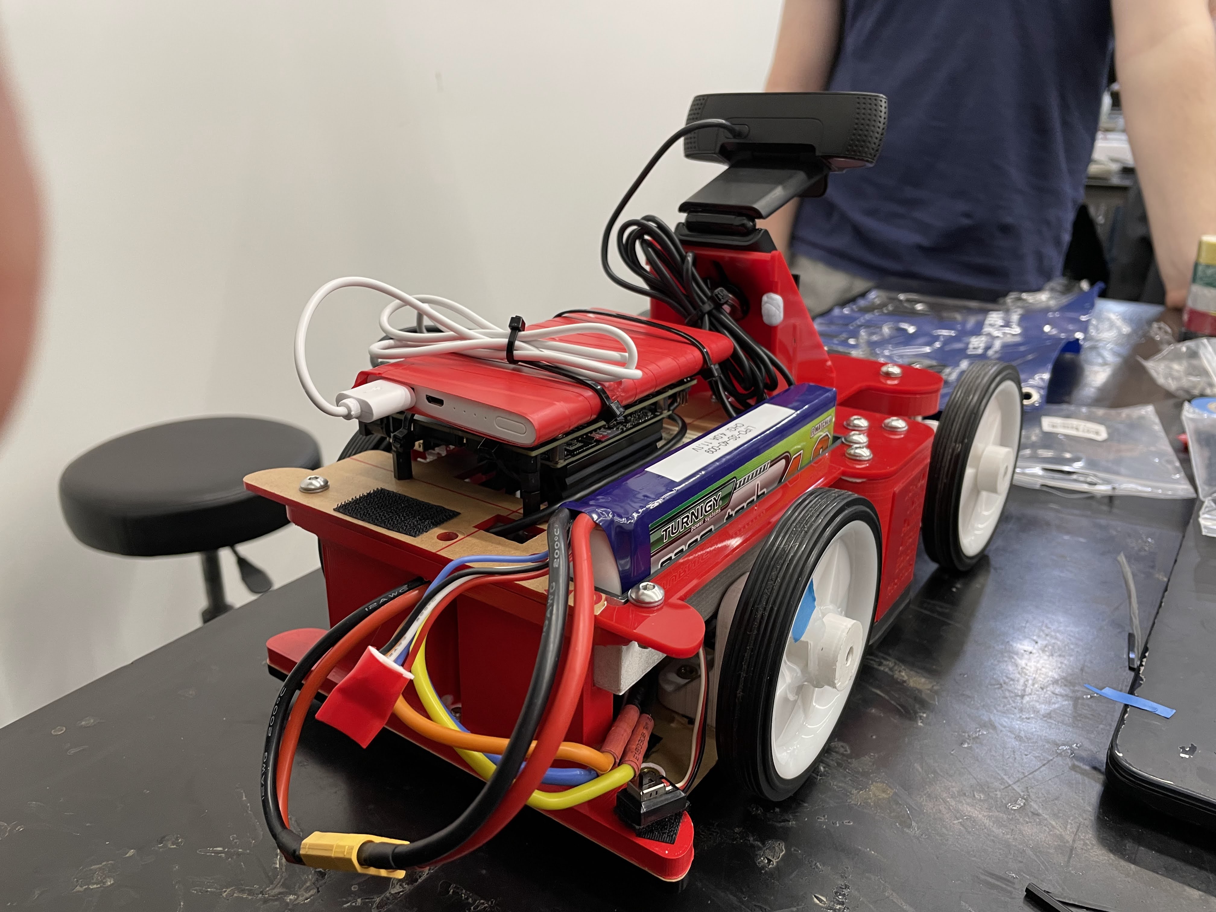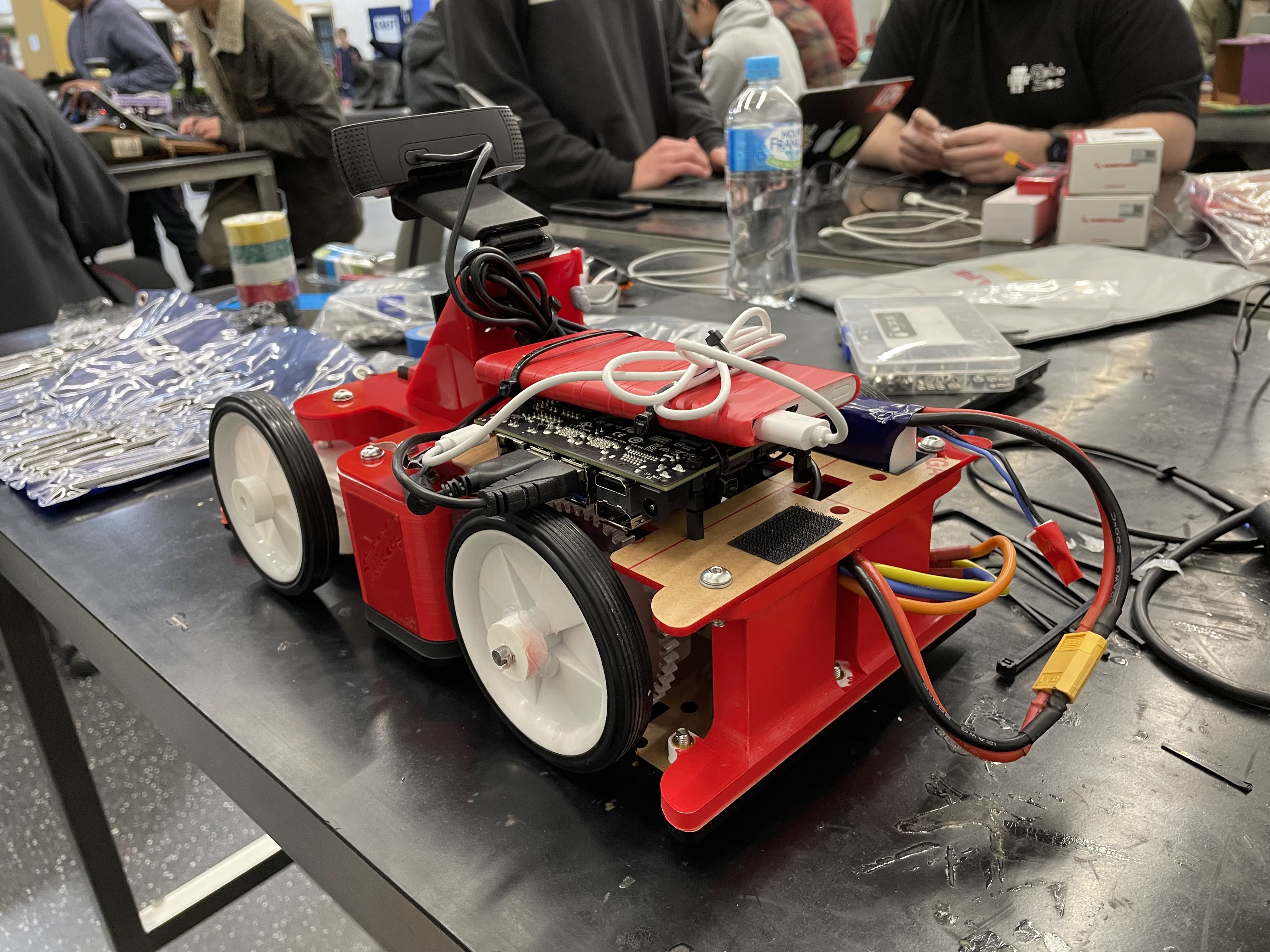 - Driving control logic was determined by a simple python script that observed the positions of the yellow (left) and blue (right) tape on either side of the track. A Nvidia Jetson Nano was used for the compute module.