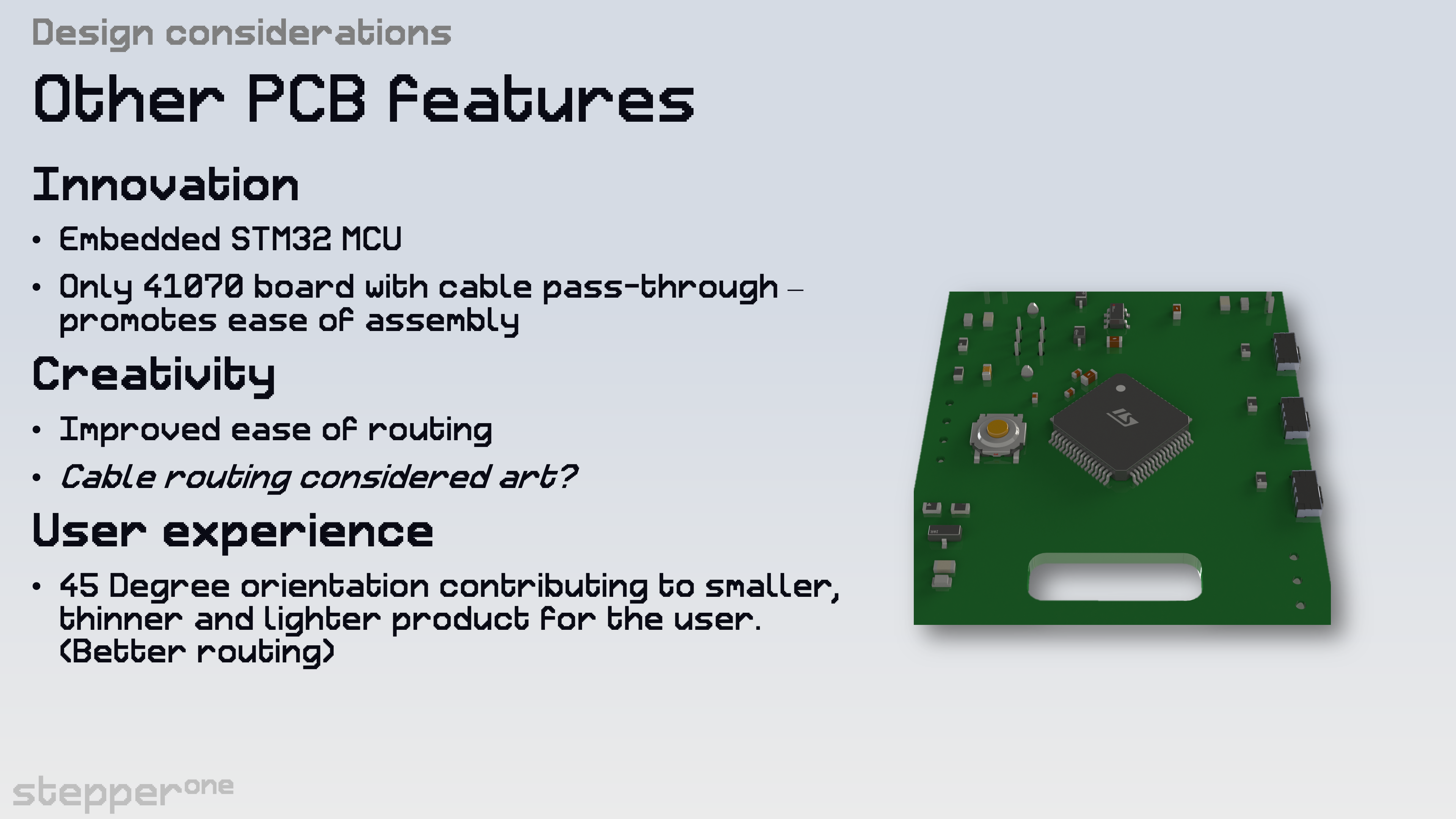 With permission, my group and I instead took the extra challenge to embed a STM32 Microcontroller onto the PCB, removing the need for an external development module. This decision was extremely profitable and aligns closer to industry expectations.